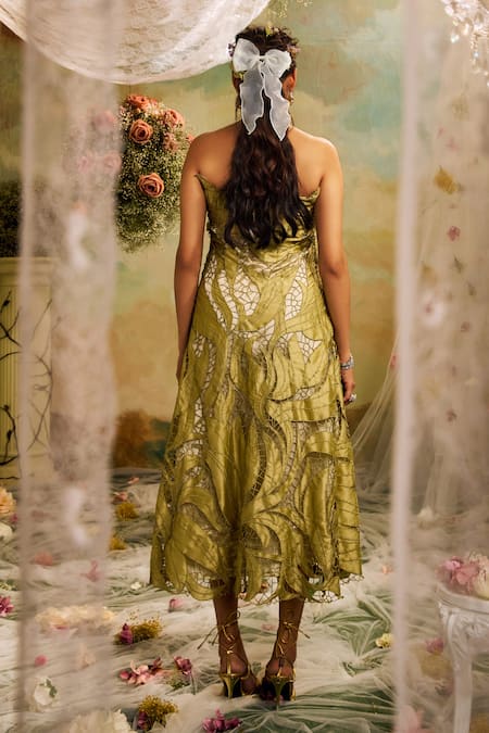 Green Silk Embroidery Off-shoulder Cutwork Midi Dress