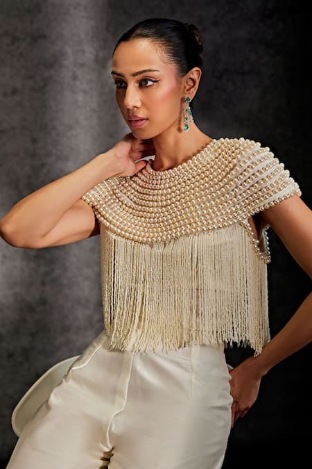 Ivory top featuring cape sleeves with misty pearls and dangling pearl bead tassels. Paired with plain bell bottom pants for a complete look.