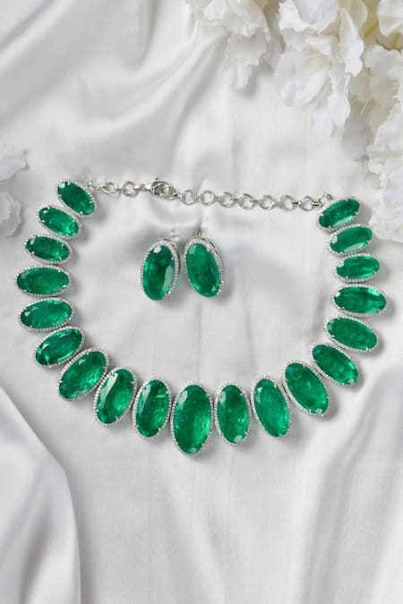 Emerald embellishments in oval shapes, Lobster clasp closure on necklace, Push back closure on earrings