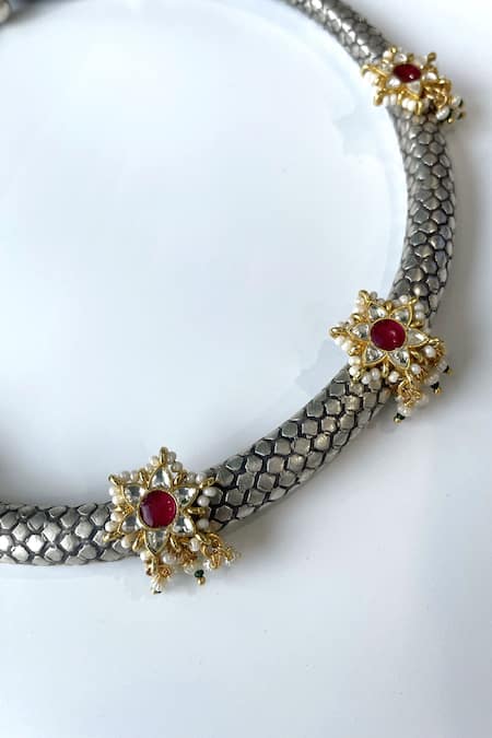 Black rhodium finish choker featuring geometric carved design with red stone and bead embellishments