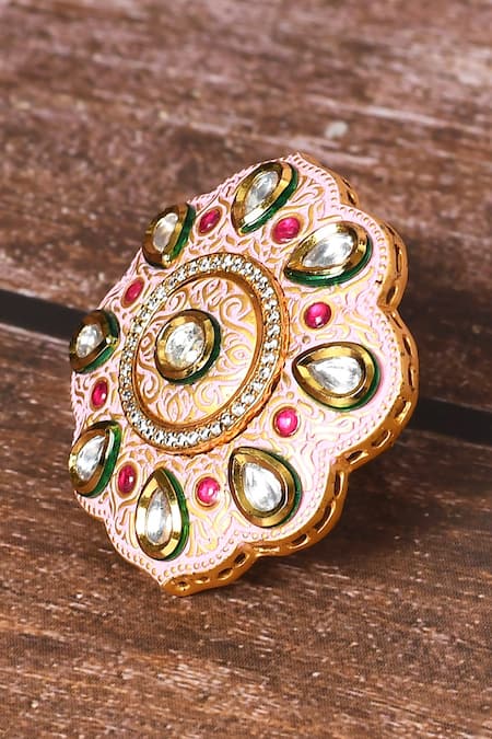 Gold finish ring featuring pastel pink enamel work with intricate gold textured detail and stone embellishments