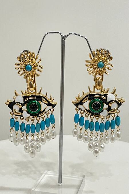 Blue dangler earrings featuring a unique eye motif with gold finish