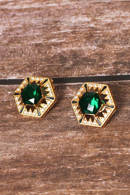 Green stone embellished hexagon shaped stud earrings featuring a gold finish
