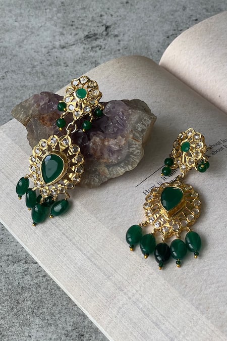 Green Beads, Zari Kundan Beaded Necklace And Earring Set