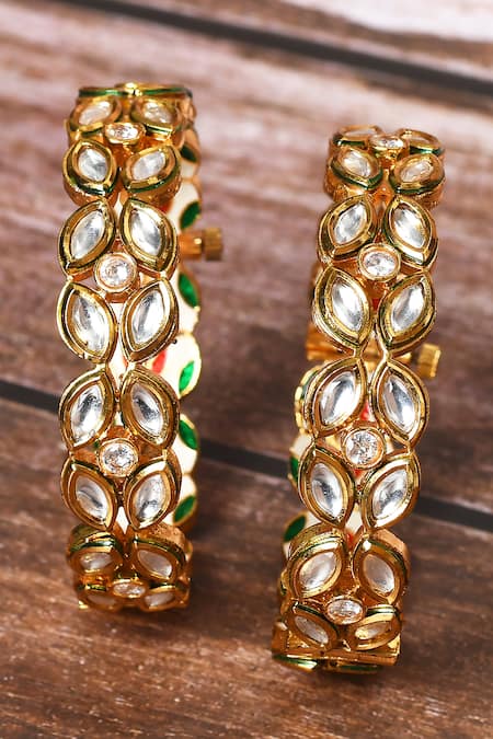 White bangles featuring intricate kundan embellishments and a gold finish. This set includes two bangles with screw back closures for secure wear.