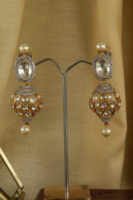 Intricate Kundan work with pearl accents, Designer necklace with elaborate detailing, Matching earrings with Kundan and pearl drops