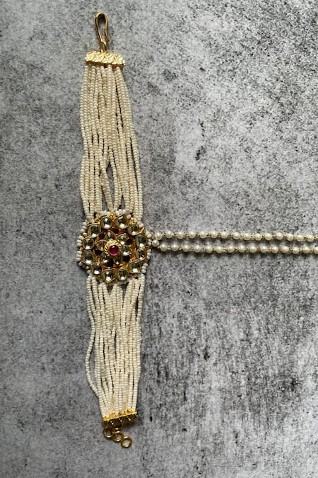 Clear pink kundan studded floral motifs, Pearl multi-chains, Adjustable hook closure