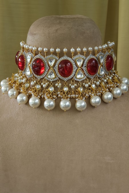 Red stone embellished choker featuring gold finish and bead drops. Includes matching earrings and maangtikka with intricate design elements.