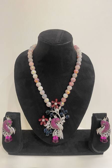 Multi colour necklace featuring a peacock motif with bead work and floral accents. Paired with matching earrings showcasing the same peacock design and bead embellishments.