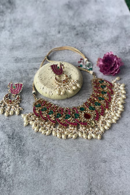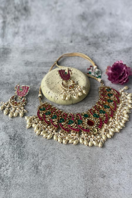 Buy_Studio6 Jewels_Multi Color Pearls, Stones Peacock Cut Work Choker Necklace Set _at_Aza_Fashions