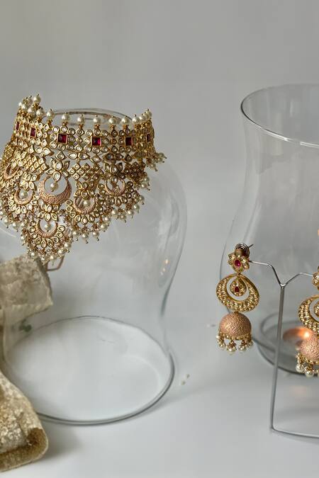 Crescent moon motifs, Kundan embellishments, Pearl drop details