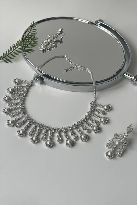 White necklace featuring pearl and zirconia embellishments. Paired with matching earrings.