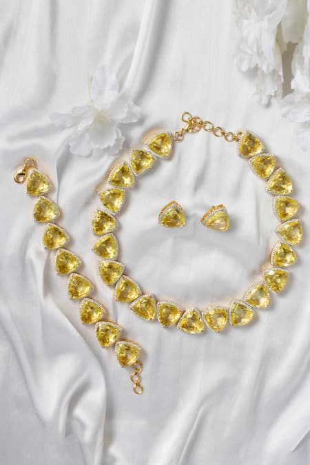 Yellow stone embellished necklace featuring a white rhodium finish. Comes with matching earrings and a bracelet, all adorned with yellow stones.