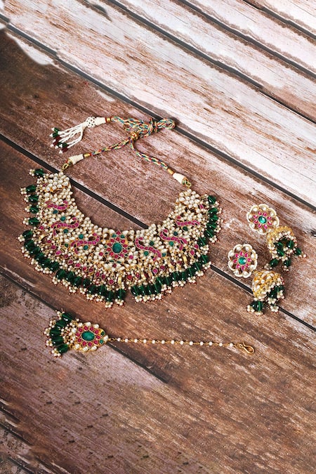 Gold finish necklace featuring multicolor stones with green bead drops and clustered pearls. Paired with matching jhumkis and maangtikka.