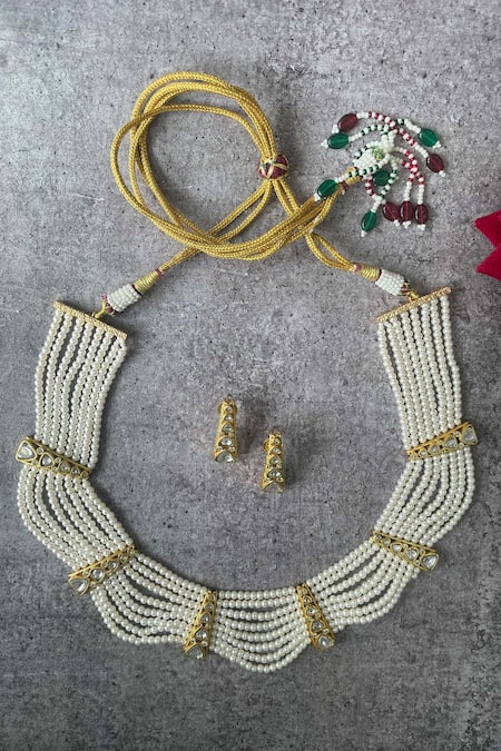 Gold pearl stone studded choker featuring layered scallop patterns with alternating pearls and stones. Accompanied by matching earrings with push back clasps.