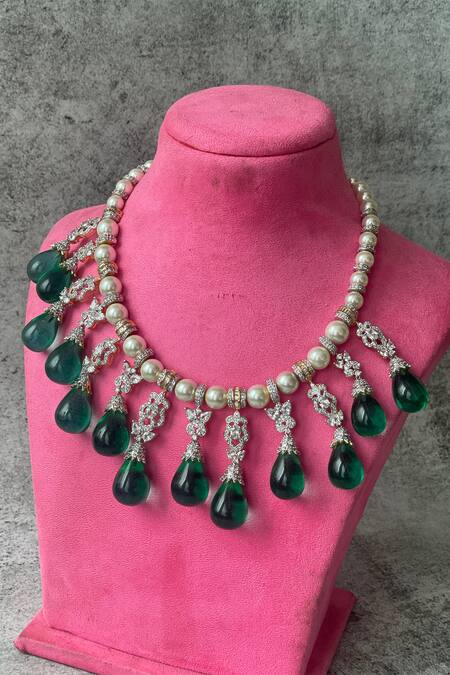 Gold plated necklace featuring zircon stones and green beads. Paired with matching earrings adorned with similar embellishments.