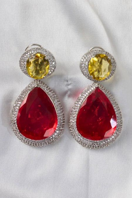 Red stud earrings featuring a teardrop design with yellow zircon embellishments