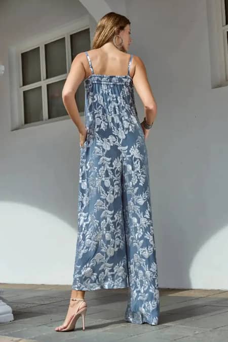 Grey jumpsuit featuring a square neckline and floral self-embroidery