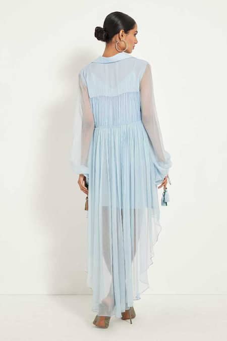 Ice blue layered asymmetric dress featuring a shirt collar and full bishop sleeves