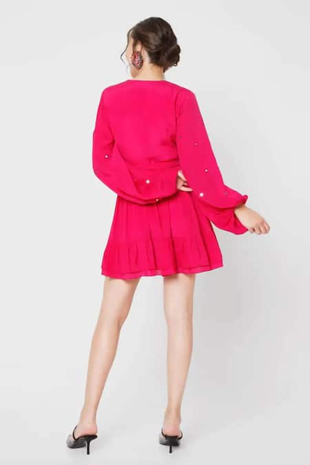 Fuchsia Crepe Embroidery V-neck Wrap Short Dress
