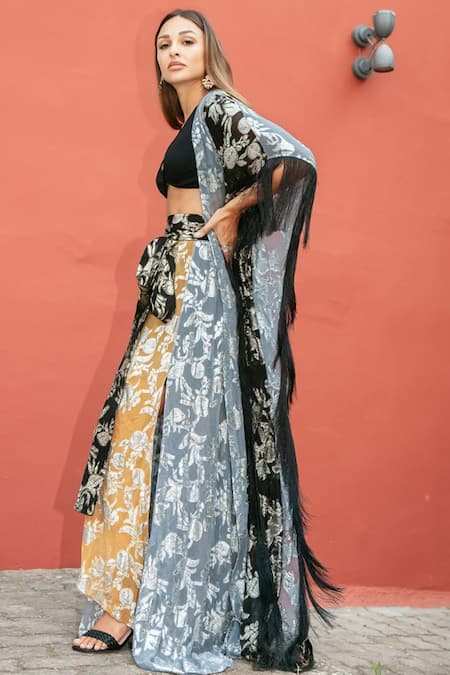 Black Georgette Fringe Open Neck Floral Patchwork Print Duster Jacket