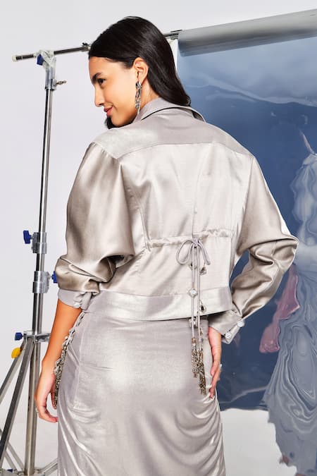 Buy_Style Junkiie_Silver Satin, Lycra Collared Metallic Bomber Jacket _Online_at_Aza_Fashions