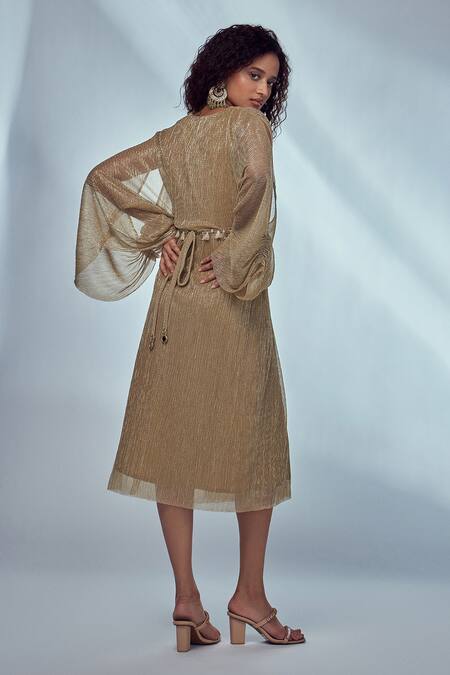 Gold shimmer knit midi dress with slit kimono sleeves and ruching. Comes with a tie-up belt having mirror and tassels work.