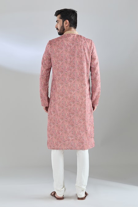 Gajri pink kurta featuring a mandarin collar and full sleeves with an all-over bloom print. Paired with a churidar in a poly blend fabric.