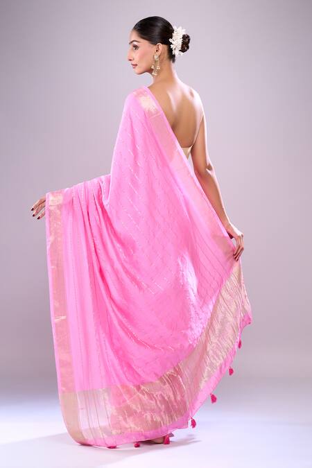 Pink Chanderi saree featuring a stripe pattern with an unstitched blouse piece. The saree is elegantly draped with a smooth finish and subtle sheen.