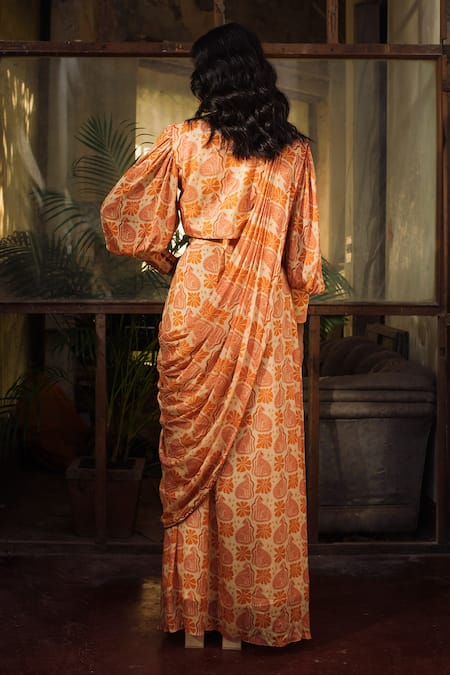 Orange pre-draped saree featuring floral and animal prints with pearl embroidery. Paired with a wrap style blouse with a plunge V neckline and puff sleeves.