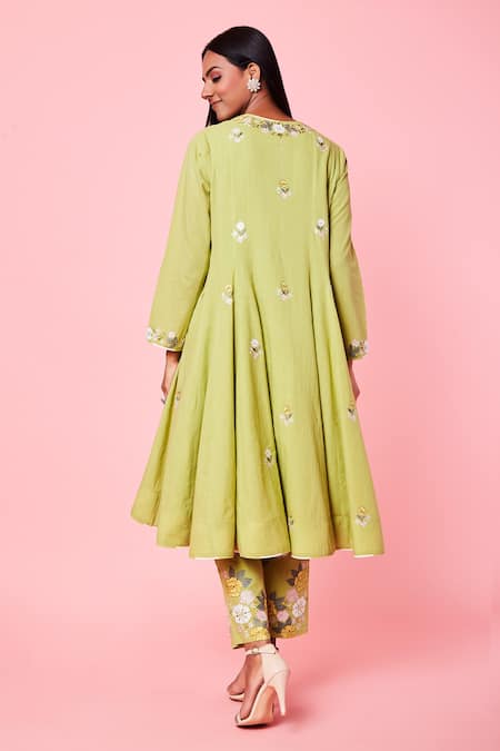 Green Cotton Zari And Resham Work V Neck Anarkali Set
