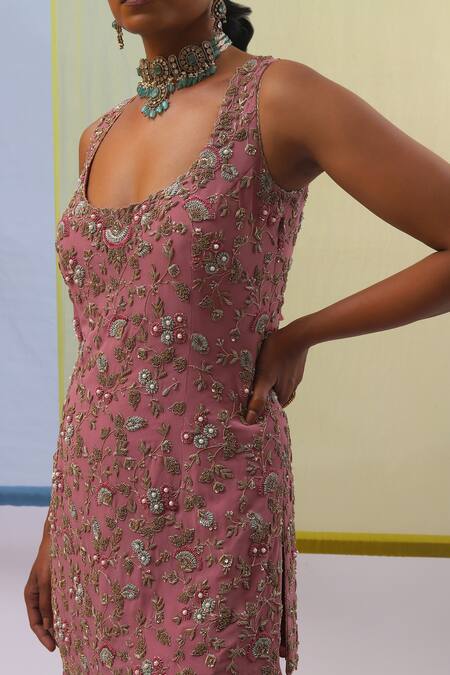 Rose pink kurta featuring zardozi, multicolor thread, sequin, pearl, and bead embroidery in a floral pattern. Paired with a matching pure silk georgette gharara and a pure silk organza dupatta embellished with zardozi floral jaal and cutwork detailing.