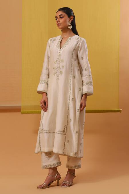 Off white kurta featuring dahlia bloom silk thread embroidery and a notched round neck. Paired with matching embroidered pant and dupatta.