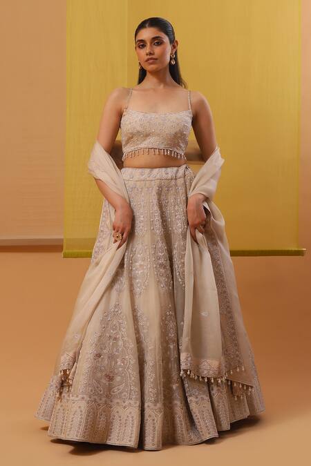 Off white lehenga featuring silk thread embroidered floral jaal motifs and applique Mughal jaali motifs. Embellished with Swarovski crystals, sequins, and pearls, it comes with an embroidered padded blouse and a pearl tassel dupatta.