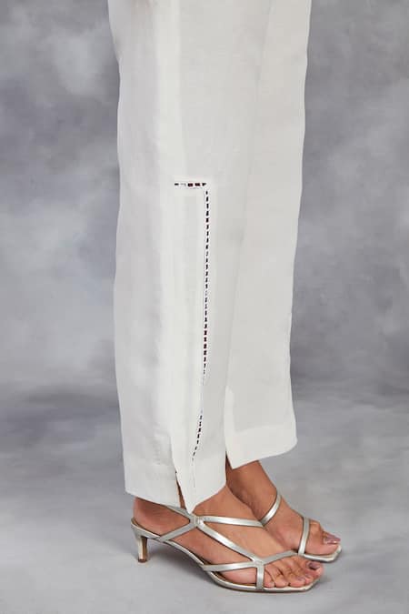 Buy_Sue Mue_White Linen Embroidery, Beads Collared Digital Print Handwoven Top With Pant _Online_at_Aza_Fashions