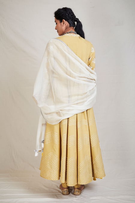 Goldenrod anarkali with resham worked floral- paisley motifs & sequin - gota embroidery. Comes with churidar & contrast tassel dupatta.
