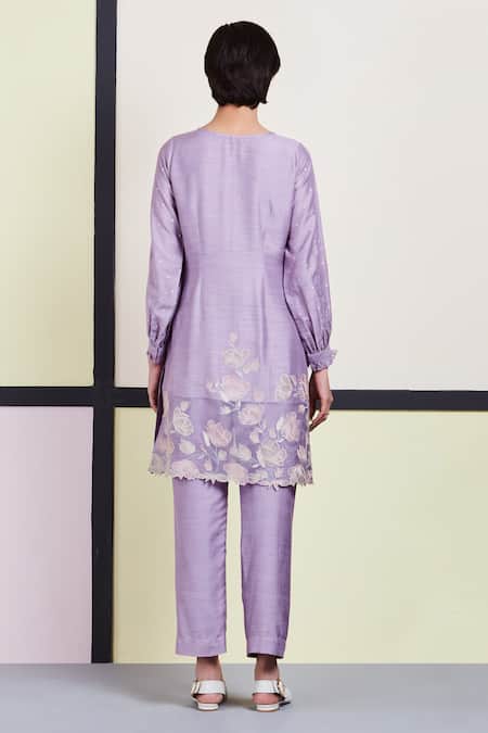 Lilac kurta with applique embroidered floral motifs on hem. Comes with pant and dupatta.