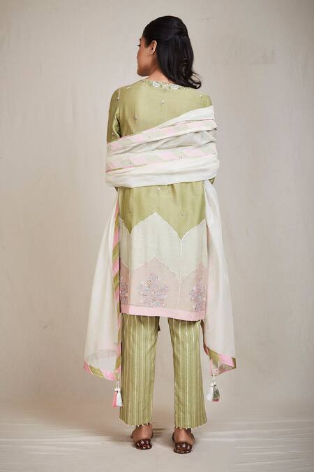 Olive green straight kurta with multi-color resham thread worked floral- paisley motifs & sequin embellishments. Comes with gota patti pants & contrast tassel dupatta.