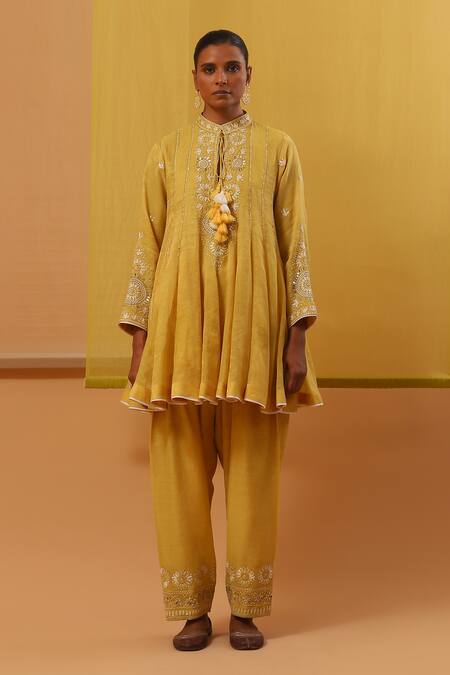 Yellow Silk Organza, Handloom Cotton Sequins, Embroidery Gulbahar Anarkali Set
