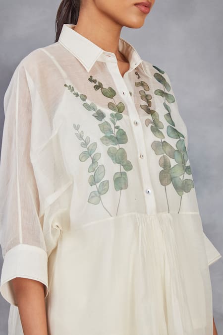 Hand painted leaves on front yoke, Slight gathering detail on front and back, Handwoven Chanderi Mulmul fabric