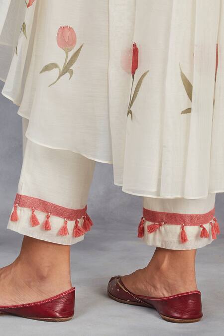 Off white handwoven anarkali featuring hand painted tulips and a high-low design. Paired with straight pants and a matching hand painted dupatta adorned with tassels.