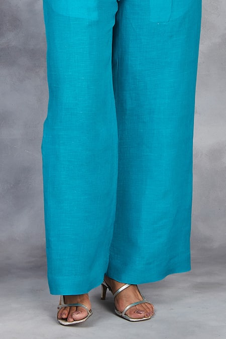 Teal blue handwoven linen shirt featuring a notched lapel, rolled-up sleeves, and front button closure. Paired with matching flared pants, both adorned with silk thread and beads embroidery.