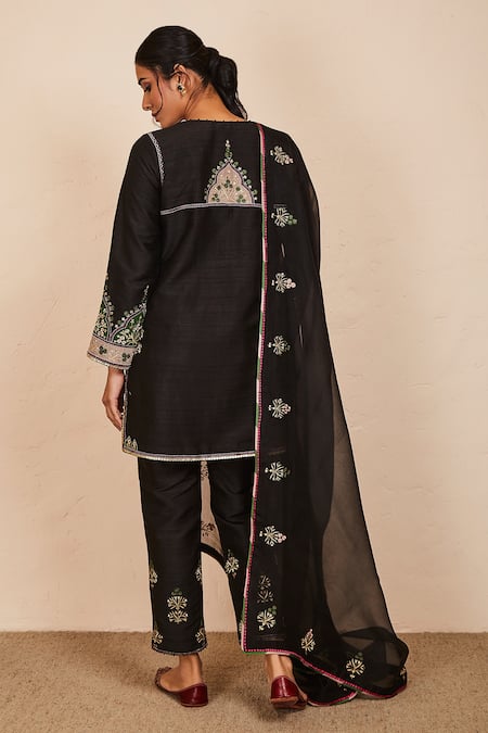 Black raw silk kurta featuring intricate zari and resham thread work with patchwork details. Paired with matching pant and dupatta for a complete look.