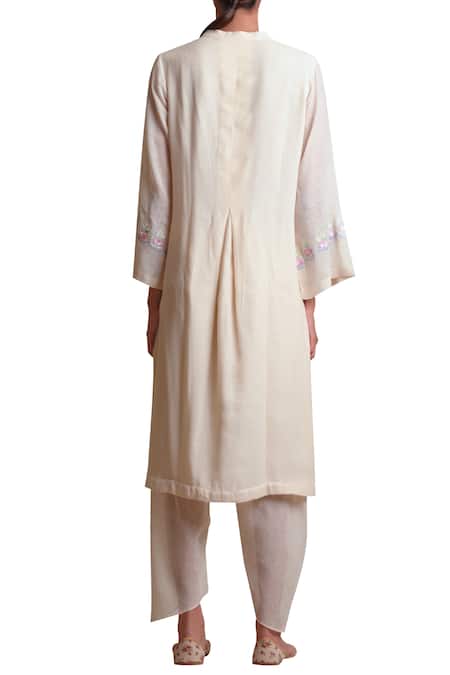 Ivory hued jute pleated kurta with floral & paisley embroidery & gather detail. Comes with salwar pants.