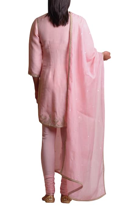 Dori and bead work pink kurta paired with matching churidar and dupatta.