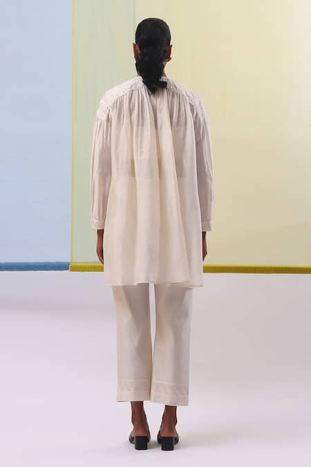 Off white tunic featuring gathered peasant sleeves and a high neck with patri fleur embroidered patches on the shoulders and cuffs. Paired with matching embroidered pants in handwoven cotton chanderi fabric.
