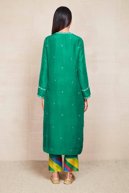 Dark green kurta highlighted with resham-zari embroidery, round neckline, loop placket, full sleeves and straight silhouette. Comes with applique pant and organza dupatta.