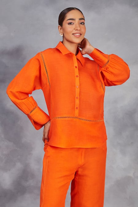 Orange handwoven linen shirt featuring placement silk thread and beads embroidery. Paired with flared pants for a coordinated look.