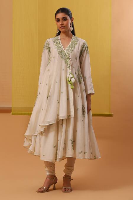 Off White Chanderi, Chiffon, Taia Flora Vine Gara Angarkha Anarkali Set