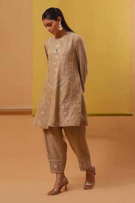 Beige A-line kurta featuring ambrosia silk thread embroidery with sequin highlights. Paired with a matching salwar and an embroidered dupatta.